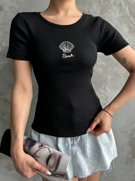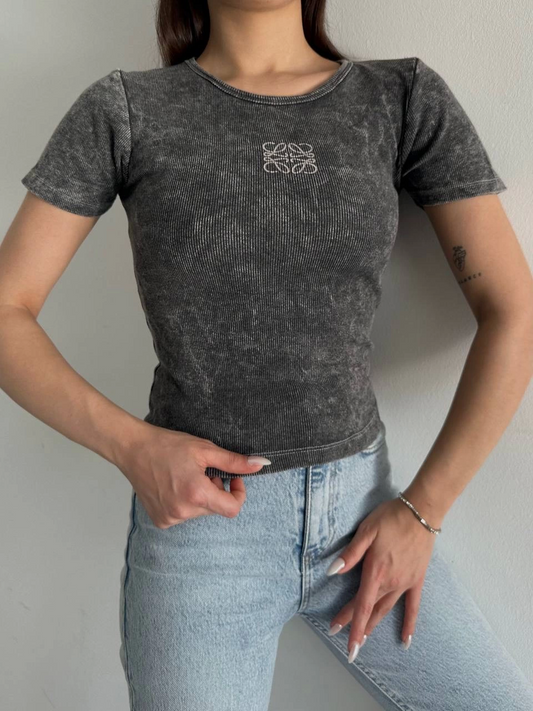 İndirimDesenli Yıkamalı Kısa Kollu Bluz